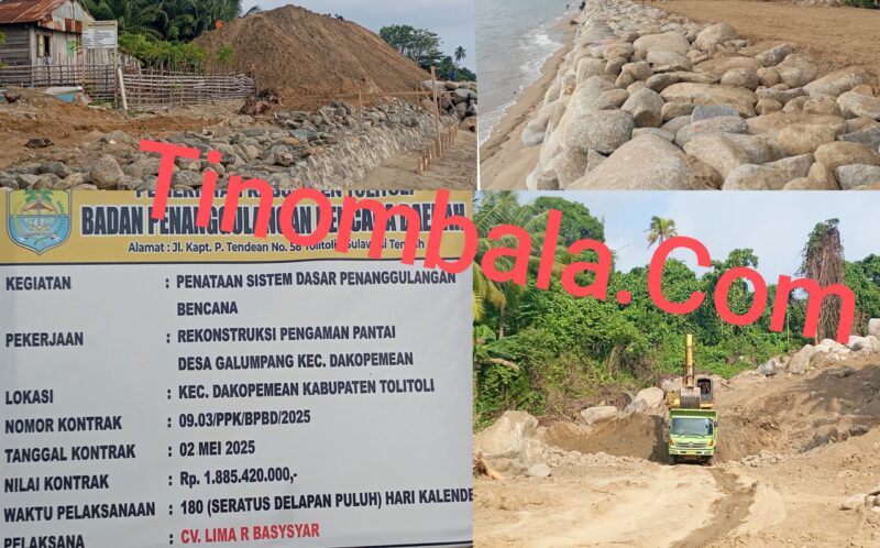 Tolitoli, Tinombala.Com // Proyek strategis rekontruksi pengaman pantai Desa Galumpang , Kecamatan Dako Pemean, Kabupaten Tolitoli Sulawesi Tengah ini menggunakan material Ilegal