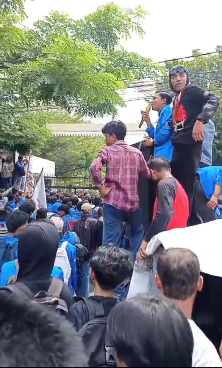 Massa aksi tiba dengan membawa spanduk, poster yang berisi tuntutan serta menggunakan mobil sound.