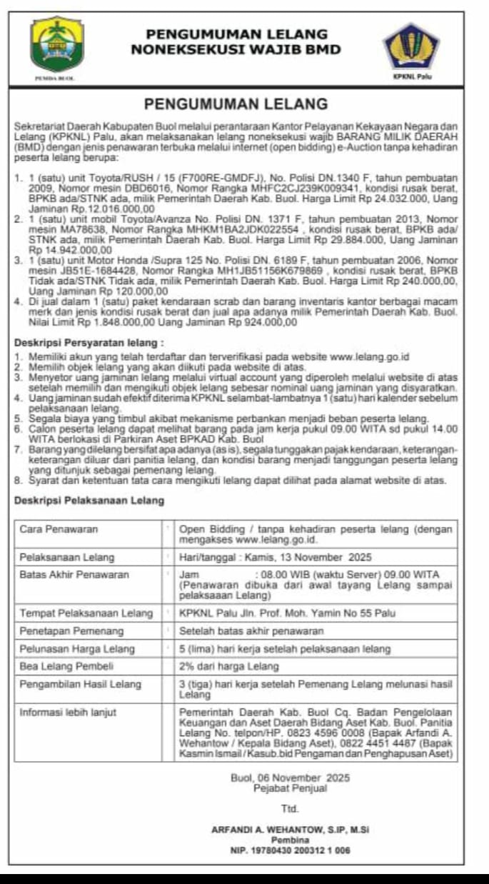 Buol, Tinombala.Com// Pemerintah Kabupaten Buol melalui Badan Pengelola Keuangan dan Aset Daerah (BPKAD) menyelenggarakan lelang barang milik daerah secara terbuka dan transparan pada bulan November 2025. Berikut beberapa hal yang perlu diperhatikan terkait lelang ini.